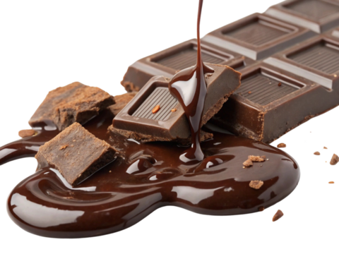 Melted chocolate with flowing streams of liquid chocolate and some solid chocolate chunks