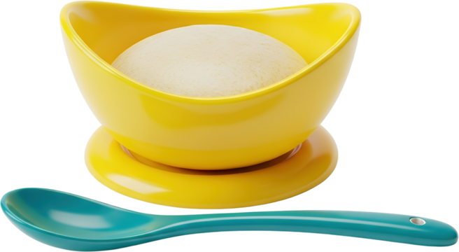 A yellow bowl filled with a creamy substance sits on a yellow saucer with a teal spoon beside it isolate
