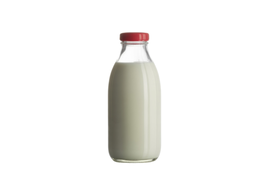 A classic glass milk bottle with a vibrant red cap, filled with fresh white milk, stands prominently on a solid transparent background. background removed
