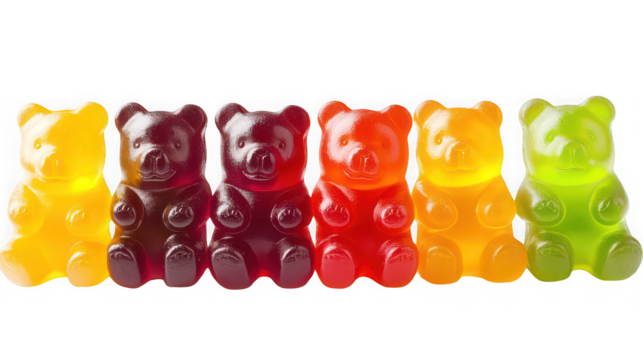 Six brightly colored translucent gummy bear candies lined up in a row against a solid for confectionery advertising