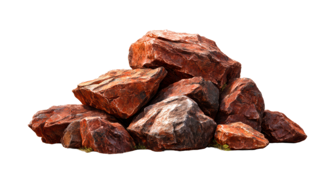 Pile of rough, textured, reddish-brown sedimentary rocks against a white background, cut out transparent