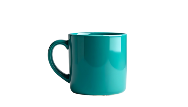 Teal ceramic mug, simple design, handle to the left, isolated against a solid black background