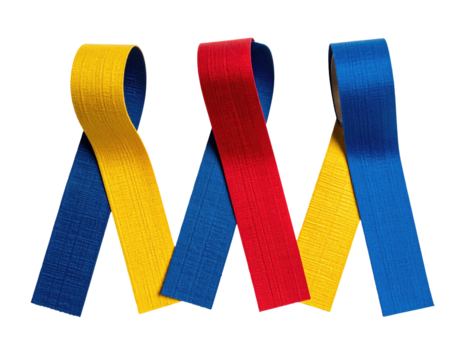 Four interwoven ribbons in yellow, blue, and red against a black background