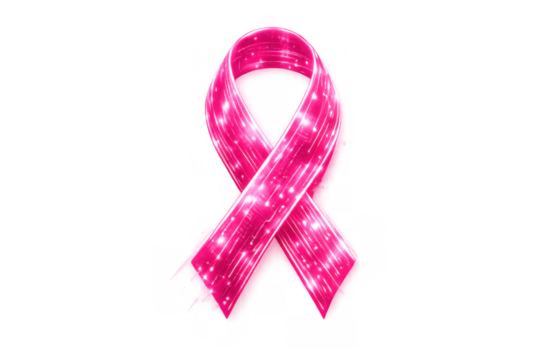 Pink awareness ribbon with glowing particles signifying breast cancer support, health, hope, and solidarity on transparent background