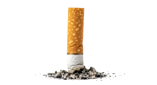 Extinguished cigarette butt resting in ash symbolizes unhealthy habits and the struggle to quit, offering a somber yet powerful image