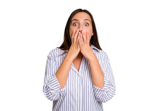 Young caucasian cute woman isolated shocked, covering mouth with hands, anxious to discover something new.