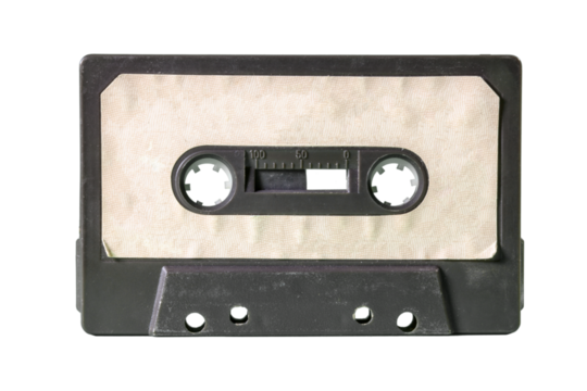 An old vintage cassette tape from the 1980s (obsolete music technology). Black plastic body, old worn textured paper label. Isolated.