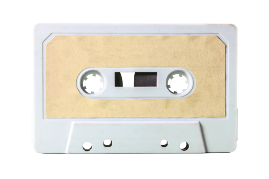 Isolated old vintage cassette tape, obsolete music tech from the 1980s. Light brown sand label, gray plastic body.