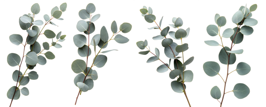 Eucalyptus branches with round and elongated leaves are neatly arranged on a transparent background, emphasizing their fresh green color and natural elegance.