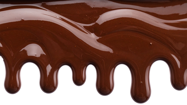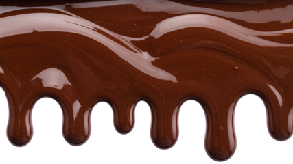 Rich melted chocolate dripping smoothly in luscious streams with glossy texture and decadent appearance isolated on white background