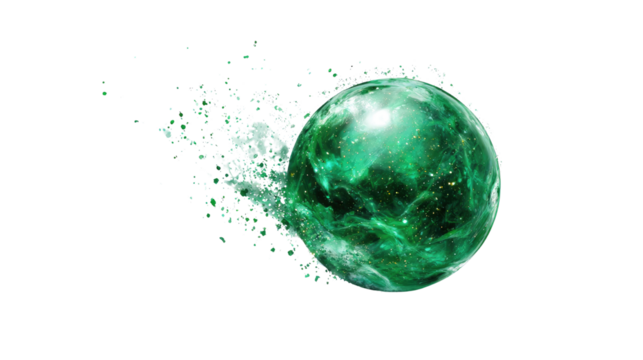 Emerald magic orb glowing with floating particles fantasy energy sphere mystical abstract design concept isolated on white background