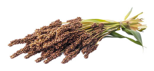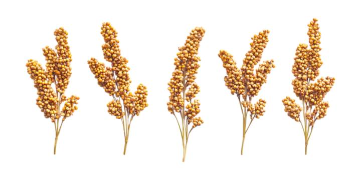 Set of five golden sorghum grain seed heads displayed for use in agricultural packaging or health food advertising isolated on transparent background.
