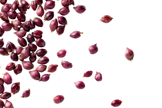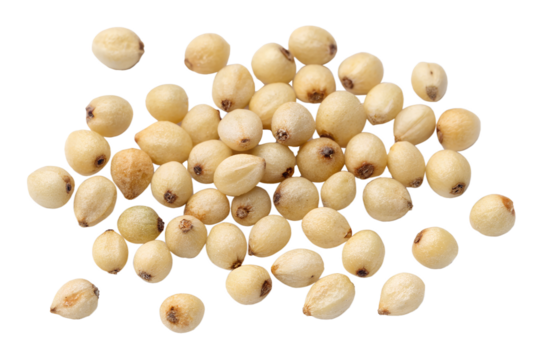 Close up of dried red sorghum grains isolated on transparent background. Close-up of scattered sorghum grains seeds isolated on white background.