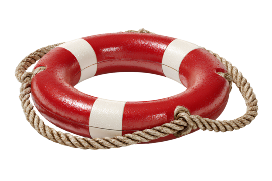 Bright red lifebuoy ring with white straps isolated on transparent background