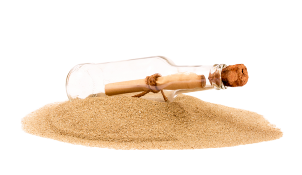 Glass bottle holding crumpled paper message, sealed with cork, symbolizing nautical communication against transparent backdrop