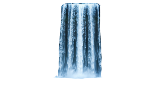 Scenic waterfall isolated on white background cascading from rocky cliffs with mist and green foliage