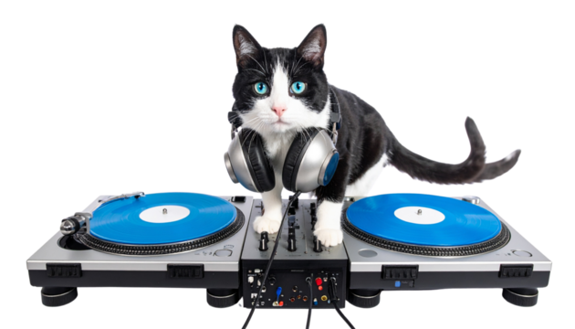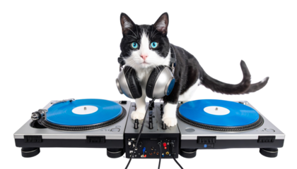 Adorable black and white cat with blue eyes playing music as a DJ, wearing headphones and standing at a turntable mixer console isolated on solid white background Png