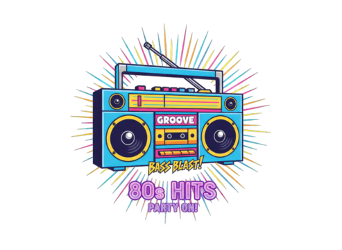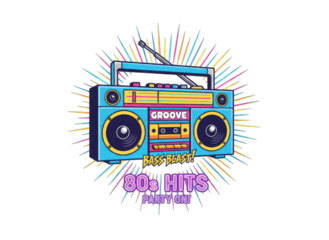Pixel Art Boombox with Colorful Rays and Retro 90s Music Party Text on Black Background