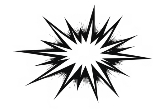 Black comic burst doodle drawing, an impact exploding graphic element with jagged lines and starburst effect on transparent background