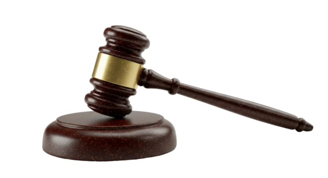 Gavel, a wooden mallet, symbolizing law, justice, authority, and arbitration, isolated on a transparent background