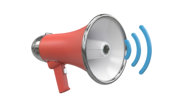 Red and silver megaphone with sound waves PNG isolated on transparent background, public address system for announcements and communication