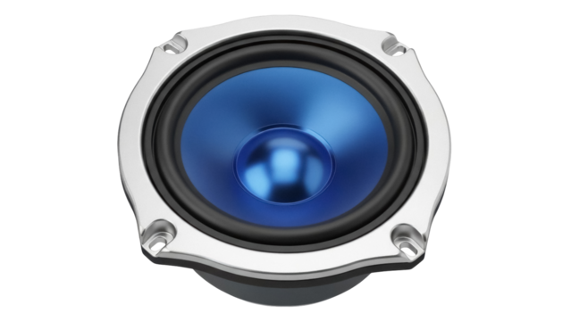 Blue speaker isolated PNG on transparent background, audio equipment for sound systems and music production, high quality loudspeaker