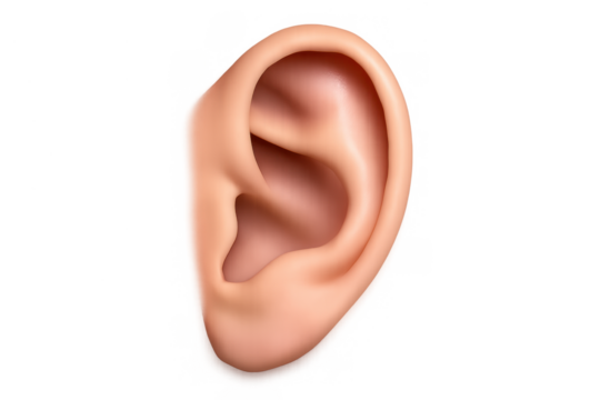Human ear organ listening and receiving sound waves. Isolated realistic anatomy of sensory hearing system on transparent background