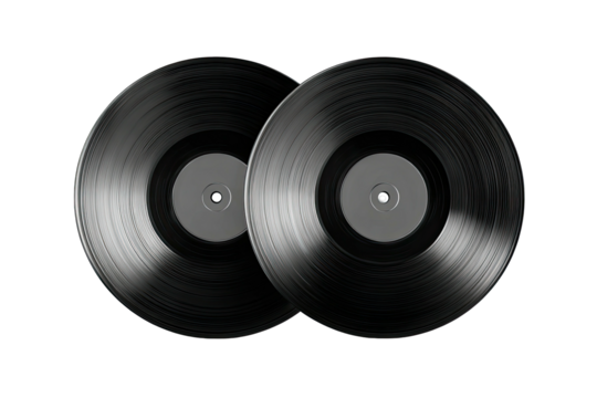 Two glossy black records with circular labels, on a black background. Classic analog music concept