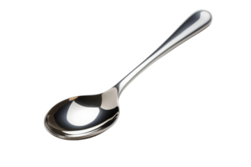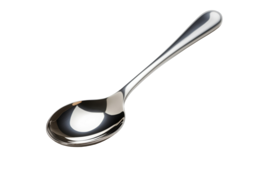 Shiny polished metal spoon with a reflective surface isolated on transparent background