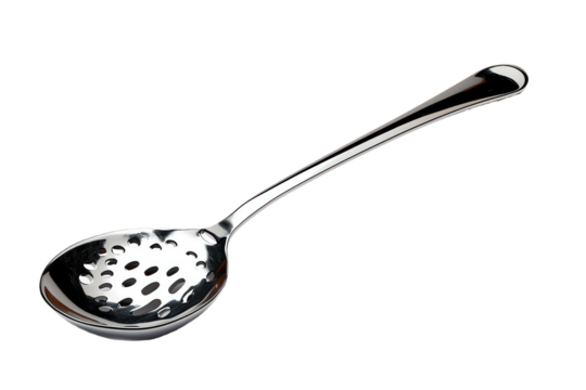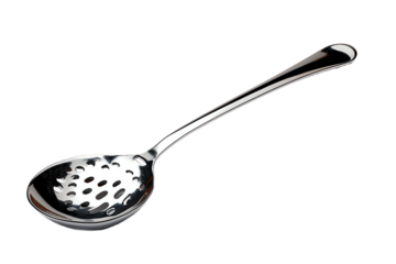 a stainless steel spoon with holes in it, Slotted spoons are commonly used for skimming liquids from food, such as removing foam from soup or grease from fried foods. They can also be used for lifting