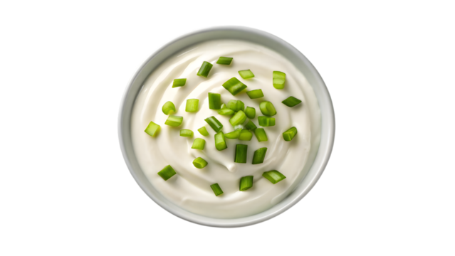A white bowl filled with creamy sour cream or yogurt, garnished with chopped chives, isolated on white isolated on transparent background