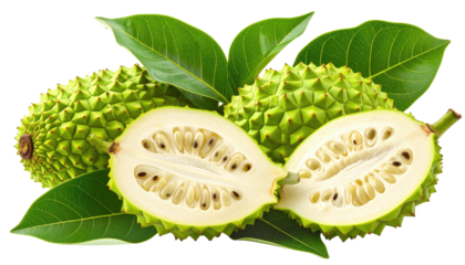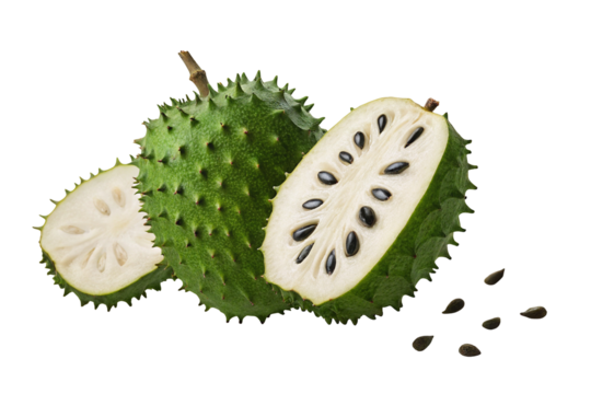 Whole and halved soursop fruit showing its white flesh and black seeds isolated on transparent background