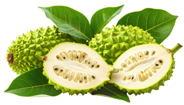 Whole and sliced soursop fruit with green spiky skin and white flesh featuring black seeds on transparent background.