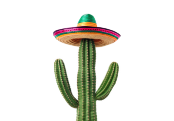 Saguaro cactus wearing colorful Mexican sombrero creating whimsical desert scene, isolated on a transparent background