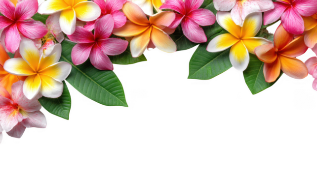 Plumeria or Frangipani or Temple tree flower. Close up yellow-pink plumeria flowers bouquet isolated on transparent background. Top view exotic flower bunch