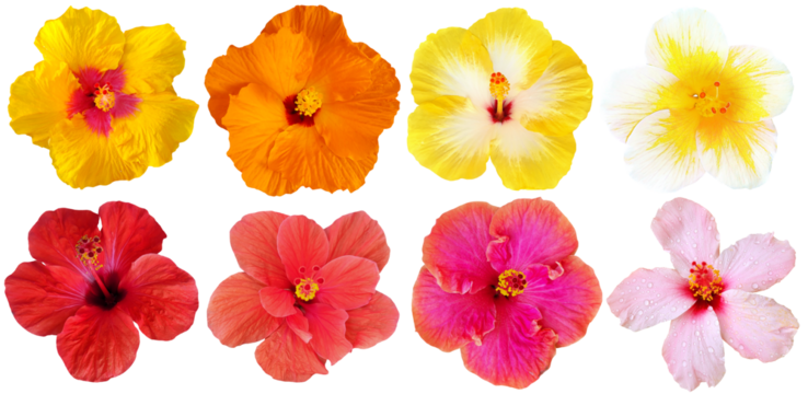 Collection of hibiscus flowers isolated on transparent background, for tropical flowers, relaxation, spa design and background