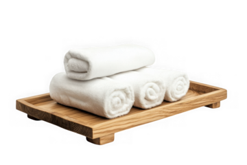 Stock photo: rolled white spa towels on wooden tray, clean bathroom cotton textile, hotel service, wellness and hygiene isolated on transparent background