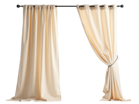 A pair of beige curtains hanging from a curtain rod, suitable for use in interior design or home decor illustrations