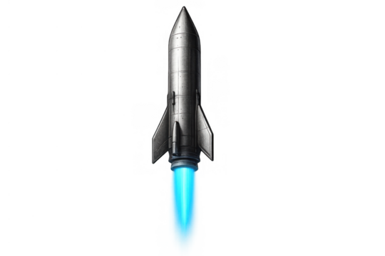 Rocket launching with blue flame, symbolizing space travel, technology, innovation, and futuristic science exploration