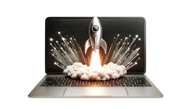 A vibrant rocket blasting off with colorful smoke trails isolated on transparent background