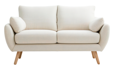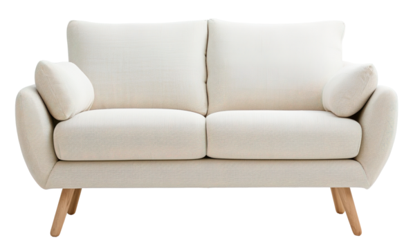 A two-seat sofa made of natural fabric sits on a transparent background. The sofa features a simple design with wooden legs and two cushions for comfort. It is suitable for various interior styles