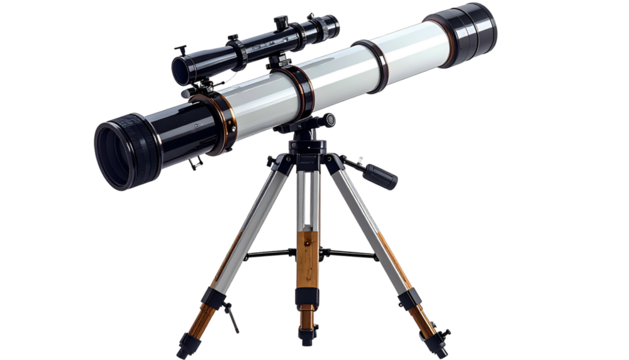 Isolated brass telescope on wooden tripod ready for astronomy night outdoor stargazing