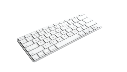 A sleek, compact, white wireless keyboard, angled slightly, showcasing its minimalist design and qwerty layout.  Keys are small, rectangular, and evenly spaced