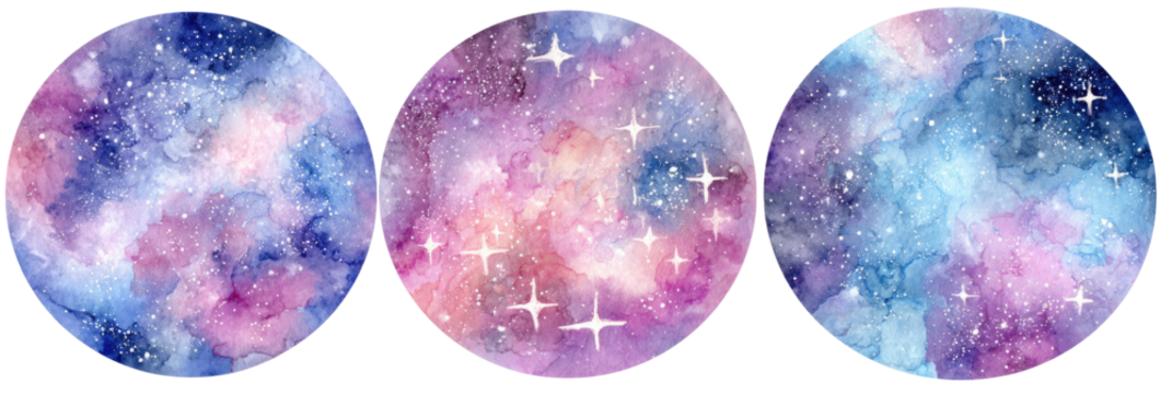 Three circular watercolor-style galaxy images.  Pastel purple, pink, and blue nebulae with scattered bright stars