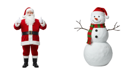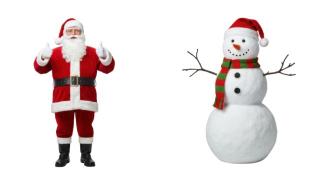 Jolly Santa Claus Giving Thumbs Up and Traditional Snowman for Christmas isolated PNG with Transparent Background