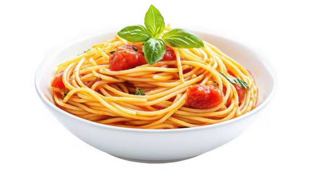 A bowl of spaghetti with tomato sauce and basil garnish on a  transparent background, close up shot view