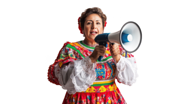 Middle-aged Hispanic woman, 50, traditional attire, short hair - Confidently using the megaphone