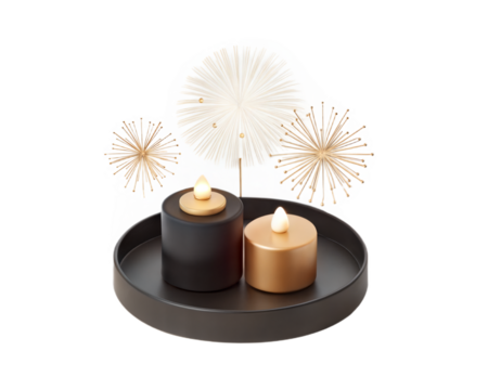 Two LED candles on a dark tray with abstract firework decorations light festive