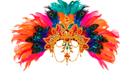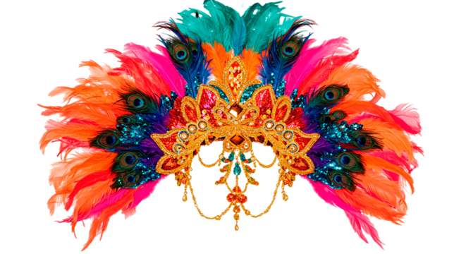 A vibrant feathered headdress with gold embellishments and peacock accents on a transparent background