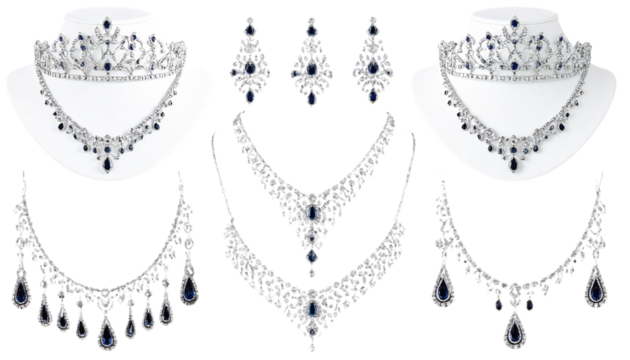 Sapphire diamond jewelry set, tiaras, necklaces on transparent background